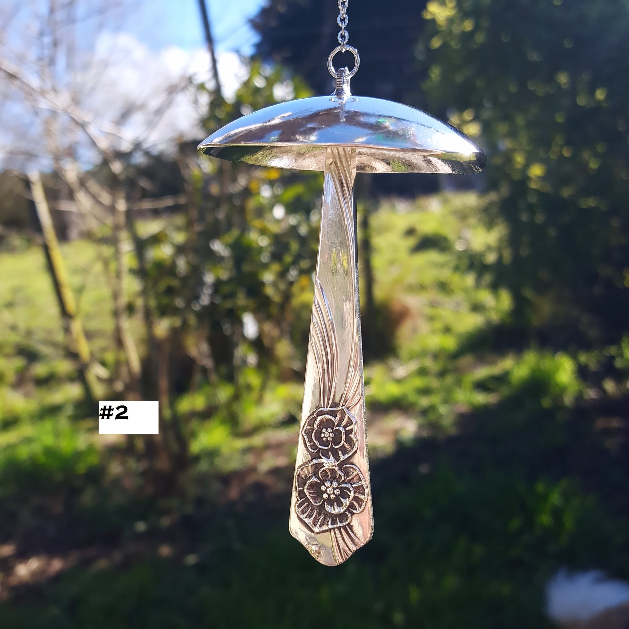 Each mushroom has been handcrafted from vintage spoons. Patina has been hadded to all the details on each handle to help the design pop.