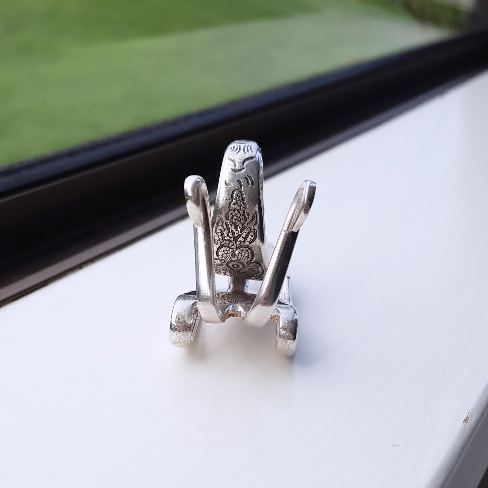 Guy or Gal, well that one is up to you. But either way, I've crafted it from a vintage fork, and the bonus for this wee one is the sweet design on the round of the "shell". I've added a patina to make all the more cuteness pop out.